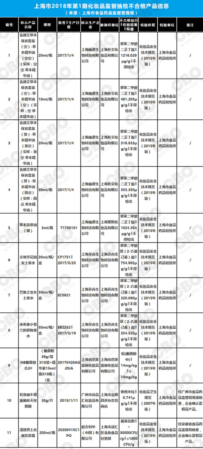 其中,標示為上海儲源生物科技有限公司生產的玄慈艾草本保養套裝(空)-草本精華油(空空)(實樣:空空 草本精華油),上海自然美富麗化妝品有限公司生產的NB敷面組合,上海芬尚生物科技有限公司生產的古埃爾花園女士香水等11批次產品不合格。