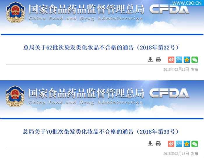 繼2月6日,國家食品藥品監督管理總局通告80批次染發類化妝品不合格后,2月13日,總局又在同一天連續發布《總局關于62批次染發類化妝品不合格的通告(2018年第32號)》、《總局關于70批次染發類化妝品不合格的通告(2018年第33號)》,披露了遼寧、新疆等地不合格的染發類化妝品。